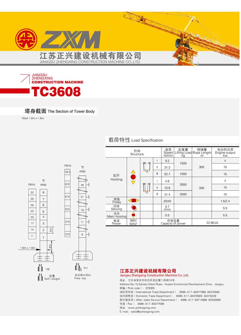 2、最大工作幅度36米,最大起重量3噸,額定起重力矩300KN.M;