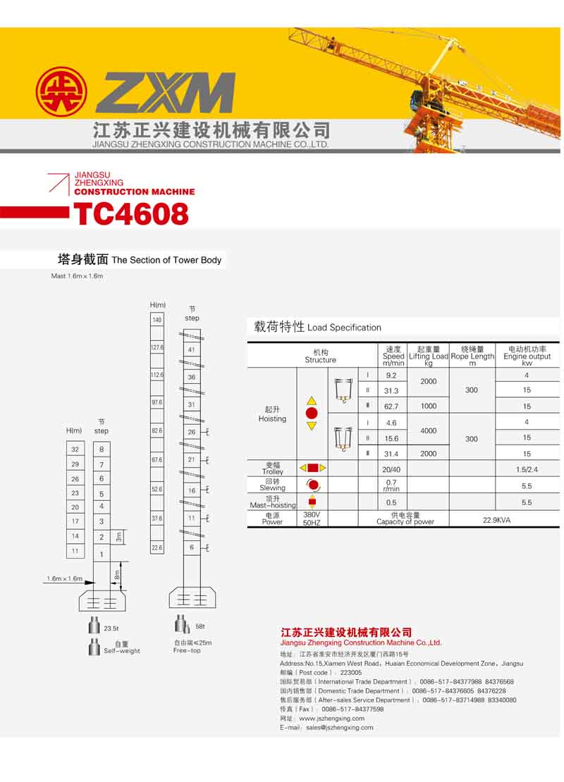 2、最大工作幅度46米,最大起重量4噸,額定起重力矩400KN.M;